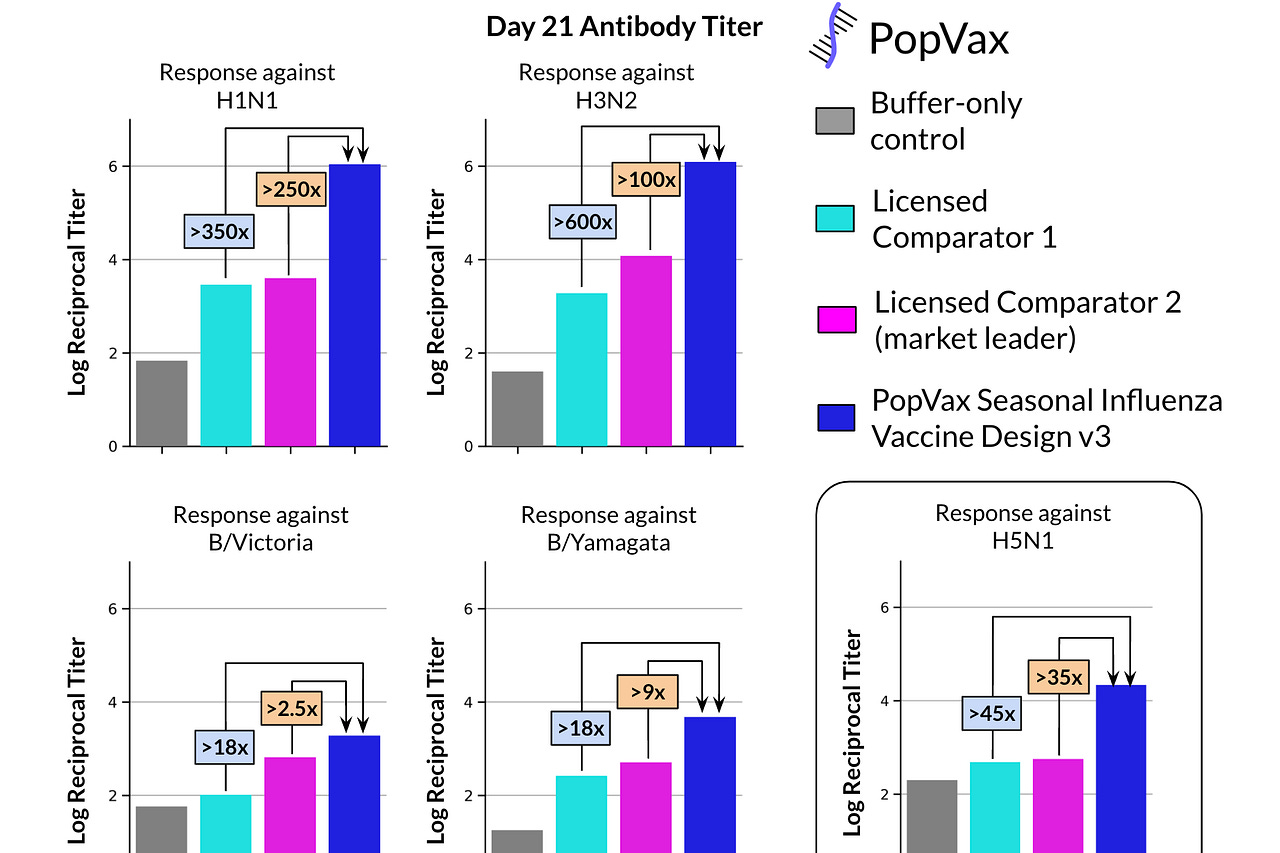 PopVax’s influenza vaccine designs elicit as much as 250x greater antibody titer against seasonal strains than existing approved flu vaccines, as well…