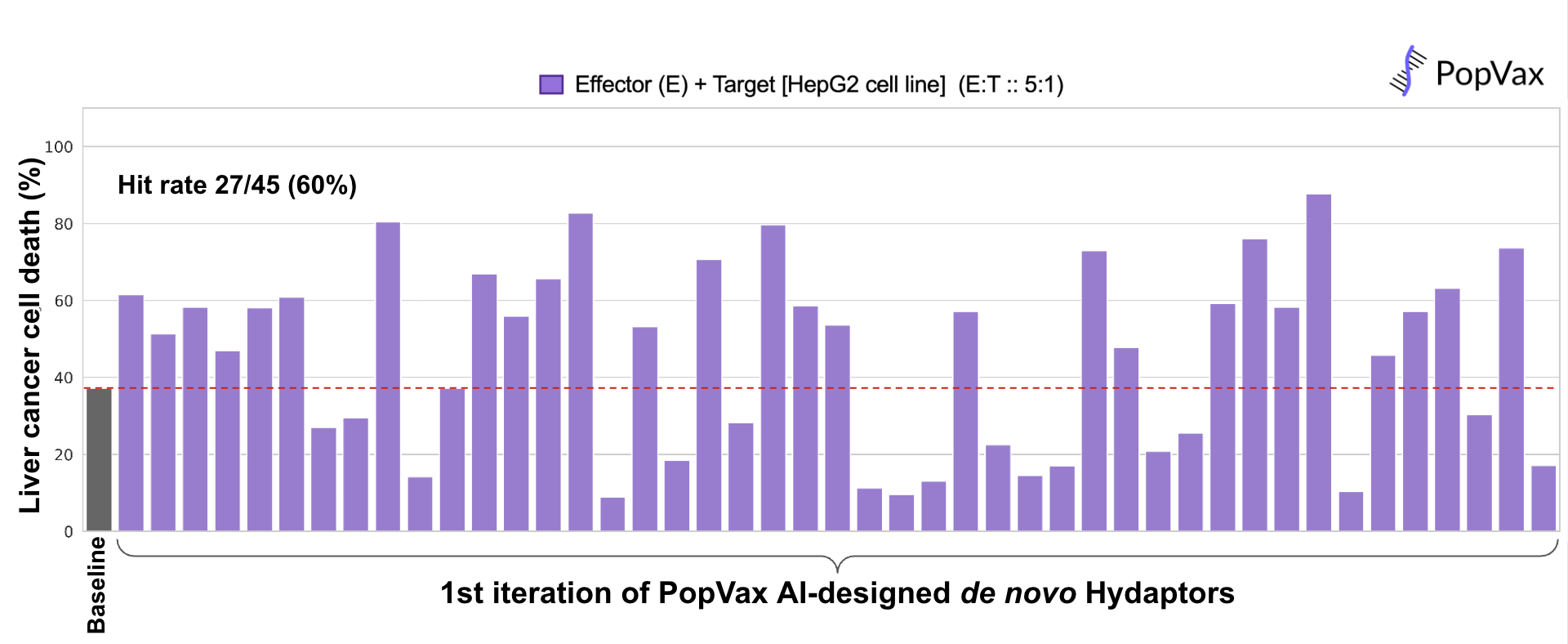 Remember the Hydaptors – PopVax’s mRNA-encoded T cell engagers I described before? We de novo designed the binders that guide them to liver cancer cells using our AI-powered protein generation, ranking, and optimization pipeline, yielding a first-pass hit rate of 60% in a functional assay measuring their ability to drive immune cells to kill liver cancer cells in a petri dish, which is competitive with the best pipelines of this kind in the world. We tested 45, but we could have tested as few as 20 and still gotten potent Hydaptors. From design to in vitro validation, this whole process took about a month, of which an entire week was lost to customs delays in transit – a far cry from the pre-AI era of binder generation via animal immunization and phage display, where getting 10 hits might have taken a minimum of 4-6 months.