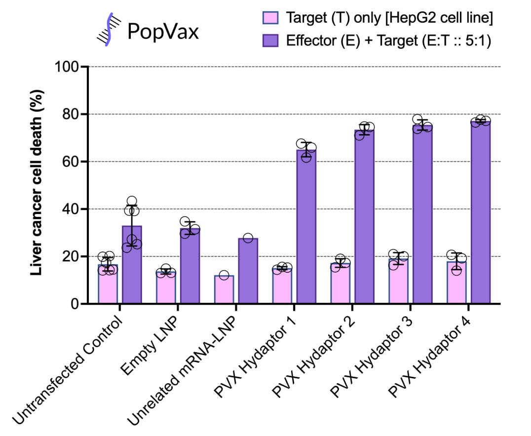 PopVax has designed and tested Hydaptors against Hepatocellular Carcinoma (HCC), the most common form of liver cancer, and found them to be highly effective at specifically killing liver cancer cells in a petri dish, while leaving other types of cells untouched.